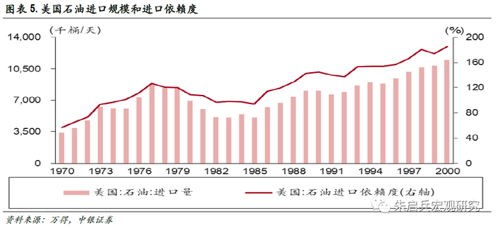 价格管制导致国内石油供给不足,加剧进口依赖。尼克松执政时期,由于存在价格管制,美国原油价格被冻结,国内原油生产受到抑制,消费被变相鼓励,导致美国原油进口规模明显攀升(见图表5)。为了解决石油供给不足问题,1973年8月,尼克松政府进一步实施石油价格管控措施,将老油(1973年前投产的油井并且不超过1972年产量的原油)价格限制在5.25美元,新油(1973年前投产的油井但超过1972年产量的部分、1973年后投产的油井)和进口原油价格不受控制。按照原计划,1974年4月结束石油价格管制,实现国际国内油价接轨。不过,第一次石油冲击爆发后,国际油价飙升。为了控制本国石油价格,尼克松政府颁布了“紧急石油分配法案”,同时根据该法案颁布联邦能源管理行政法令,对原油产量采取“老油”和“新油”两级价格机制进行管制。福特上任后继续推动国家能源管理,“1975年能源政策与节约法”提高了两类油的价格水平,但仍与国际油价存在差距。卡特上任之后,签署了“1978年国家能源法案”,规定分阶段取消对石油价格的控制。1979年4月,卡特宣布计划从1980年1月至1981年9月解除石油价格管制,同时要求国会通过暴利税法,将所得税收用于鼓励研发新能源。不过最后,卡特的能源计划随着竞选失败而被迫中止。