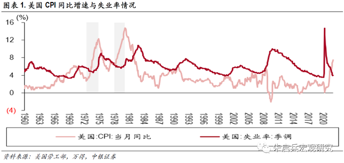 本轮美国大通胀和1970年代大通胀的相同之处主要有两点:一是,通胀背后都有供给冲击的影响;二是,美联储货币政策均落后于通胀曲线。不同之处则体现为,美联储货币政策可信度提高,美国经济灵活度增强,这意味着当前美联储激进加息的紧迫性弱于沃尔克时期。