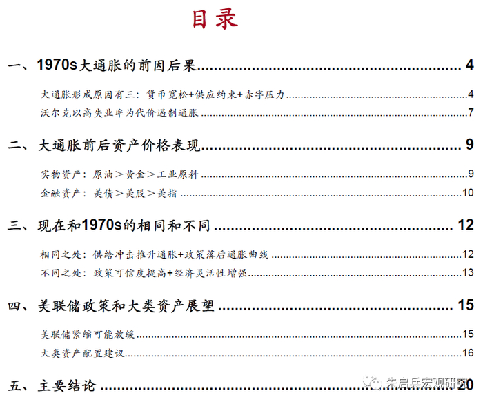 1960年代中后期,美国经济快速扩张带动价格上涨,实际GDP年均增长4.8%,月度CPI增速从1%最高升至6.2%。1970年代,CPI经历了两波上涨,分别在1974年12月、1980年3月达到阶段性高点12.3%、14.8%(见图表1)。这一轮大通胀主要受三方面因素推动。