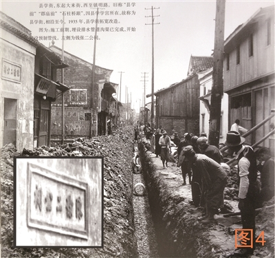 后来有群友判断旧影左侧门楣上的文字为“钱张二公祠”。“钱张”两字虽不清,但“二公祠”三字可确定。于是顺藤摸瓜查《鄞县通志》,其中果然有钱张二公祠记载,志书还说钱张二公祠旧名旌忠庙,位于孔庙镇县学前。县学前即现今的县学街,功夫不负有心人,在老地图上果真找到了旌忠庙标注,于是将旧影中的这条街,从南大路“搬到”了县学街。