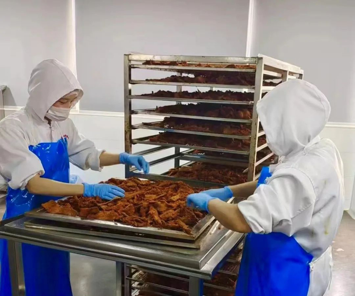 因为咱们的肉干烘烤时间更长,出肉率就比较低,1斤鲜肉才出3两左右的肉干。