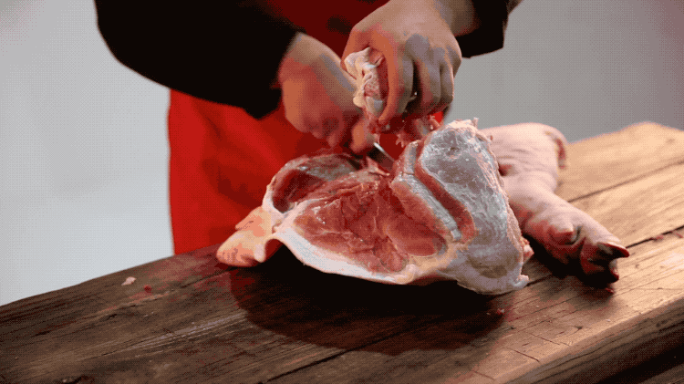 将后腿肉上多余的筋膜、皮膘、肥油一点一点仔细剔除,可急不得、快不得。