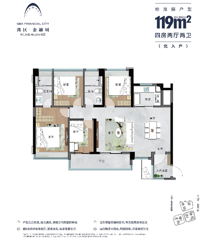北入户的119㎡四房主打超6米会客横厅,为业主接待亲朋好友、举办家庭聚会留足了活动空间。主卧在套间设计外,还预留了衣帽间空间,让男女主人在外出之前,可以惬意挑选心仪衣物。南向大阳台可以让业主在休憩时尽情欣赏景致,也可以打造“迷你健身房“,享受美景与健康。