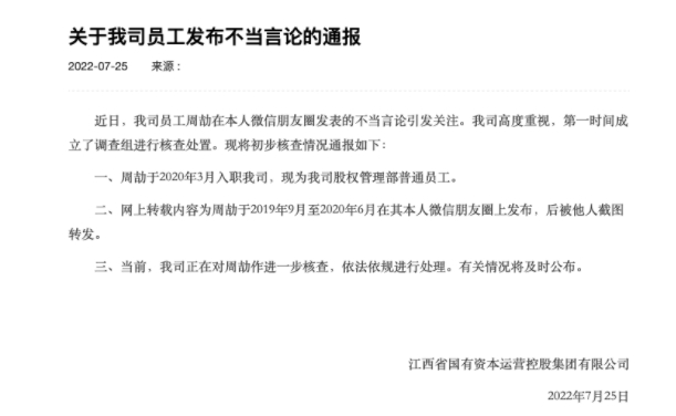 事件发生后,江西国控在其官网发布声明称,周劼于2020年5月入职,现为公司股权管理部普通员工,当前正对其作进一步核查。