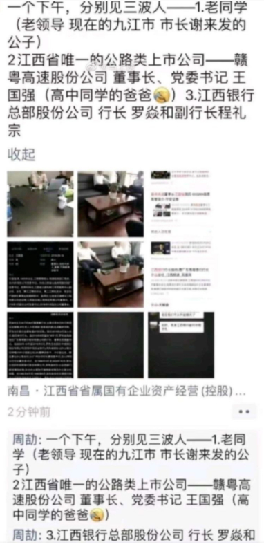 值得注意的是,在其朋友圈中“出场”的人物中,出现港股上市银行江西银行行长罗焱及副行长程宗礼(周劼误写为“程礼宗”)。