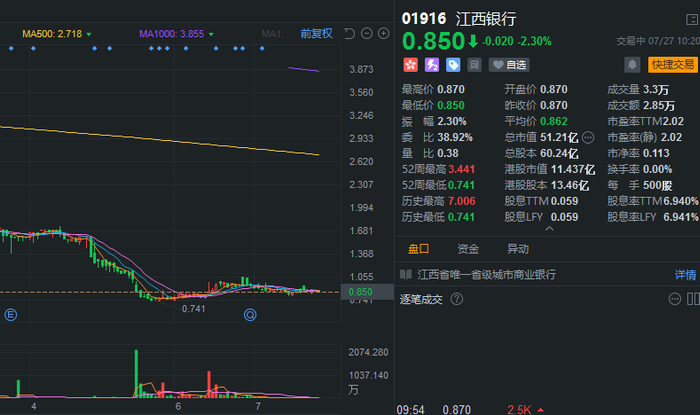 江西银行在港股上市后经历了一大波下跌,目前市值仅剩51亿港元,股价0.85港元。