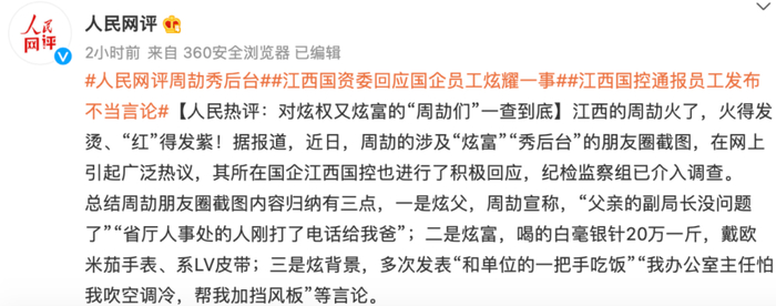 最近,一则炫耀的朋友圈,将江西省国有资本运营控股集团有限公司(以下简称“江西国控”)的一名工作人员周劼推进了大众的视线。