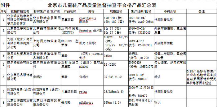 北京市儿童鞋产品质量监督抽查不合格产品汇总表