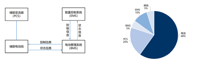 主要包括电池、电池管理系统(BMS)、变流器(PCS)、能量管理系统(EMS)、屏柜电缆以及土建安装等几大部分。