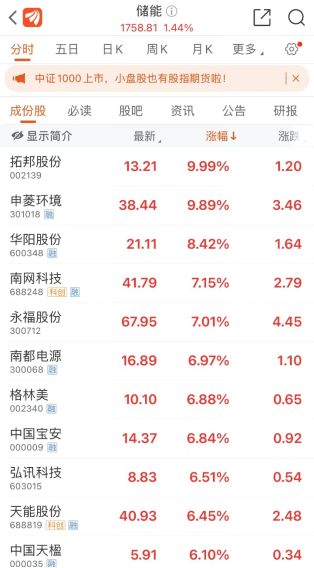 上午,储能板块中,伊戈尔、三花智控、拓邦股份涨停,几只龙头股固德威上涨4.54%,派能科技上涨3.85%,阳光电源上涨4.33%。