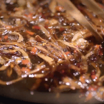 至于烹制过程,滇菜大师董超宇偏爱的方式是:先加热,让鸡枞释放水份,而后再文火炼制。在邱北红辣椒、文山草果、团结乡花椒等董超宇独家配比出的辅料助攻下,5、6个小时的油烹,随着油温的升高,每一丝鸡枞鲜香都被紧紧锁在热油之中。鸡枞条更是和市面上干炸出的枯枯的口感完全不同,一口下去,腴鲜十足,筋道又十分易嚼化。