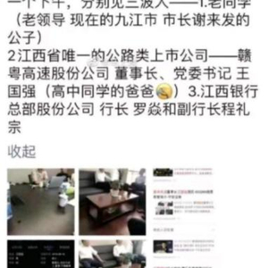 “和单位一把手吃饭,父亲的副局长没问题了”、“办公室主任怕我吹空调冷,直接叫物业的过来调节”等朋友圈炫耀言论,让江西省国有资本运营控股集团有限公司(以下简称“江西国控”)员工周劼进入大众视线。