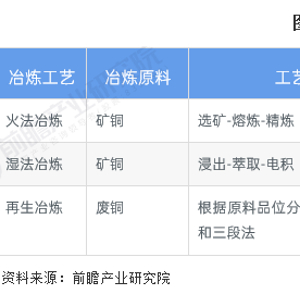 目前世界上生产电解铜的冶炼方法主分为两大类,即火法冶炼和湿法冶炼。此外随着再生资源利用率的提高,以废铜为原料的再生冶炼规模也在逐渐扩大。三种不同铜冶炼工艺对比如下: