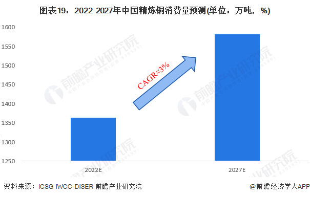 2022年,全球经济前景疲软,同时由于俄罗斯-乌克兰局势以及中国与新冠疫情对中国制造业活动产生的负面影响,根据ICSG信息,2022年中国精炼铜消费量将增长1%左右,达到了1364万吨。之后在全球疫情状况好转,新能源技术大规模应用所带来的精炼铜需求增长的大背景下,结合国际铜研究组织(ICGS)、国际锻造铜委员会(IWCC)及澳大利亚工业、科学、能源和资源部门(DISER)对全球及中国市场的预判,预计2027年中国精炼铜消费量将达到1581万吨左右,复合增长率约为3%。