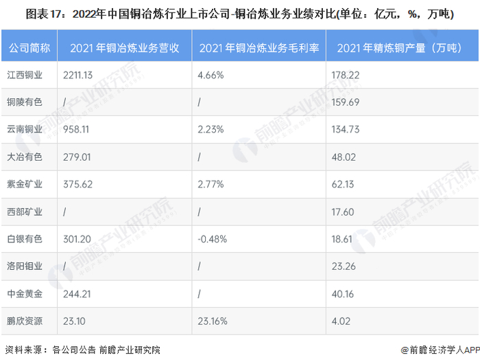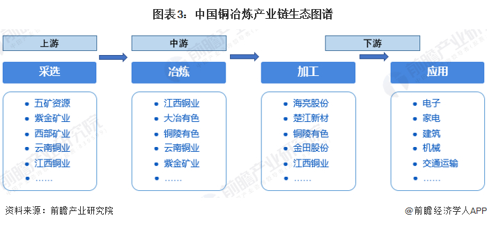 铜冶炼上游采选环节代表企业有五矿资源、紫金矿业、西部矿业等;中游冶炼环节代表企业有江西铜业、铜陵有色、云南铜业、大冶有色等;下游加工环节代表企业有江西铜业、金田股份、海亮股份、楚江新材、铜陵有色等。