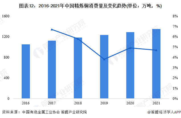 2016-2021年,中国精炼铜消费量呈现稳定递增态势。2021年,中国精炼铜消费量为1350万吨,相比2020年增加了4.7%。