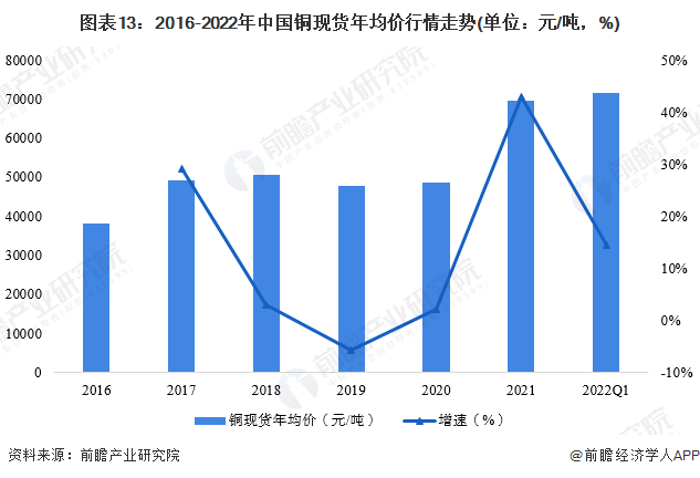 2022年第一季度,中国铜现货均价71672元/吨,同比上涨14.4%,相比2021年铜现货均价进一步增长了2.85%。