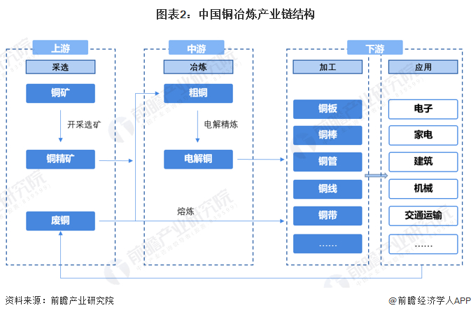 铜冶炼产业链上游为铜矿石采选以及废铜回收环节;中游为冶炼环节,铜矿石或废铜在这一环节通过电解、熔炼、精炼等步骤提炼出电解铜;下游为加工和应用环节,主要将电解铜通过压延、锻造等多种方式加工成各种形态的铜材,然后进一步加工成铜制品,广泛应用到电力、家电、建筑和机械、电子器件等领域。