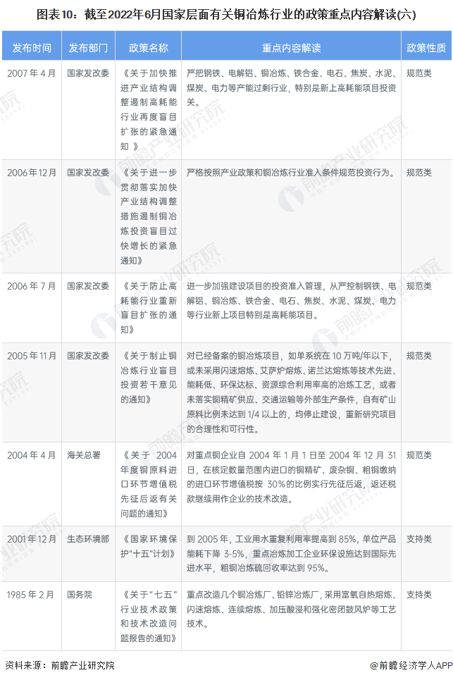自1985年国务院印发《关于“七五”行业技术政策和技术改造问题报告的通知》中指出,重点改造几个铜冶炼厂、铅锌冶炼厂,采用富氧自热熔炼、闪速熔炼、连续熔炼、加压酸浸和强化密闭鼓风炉等工艺技术。到2022年6月工信部印发《工业能效提升行动计划》指出,深入有色金属等行业节能潜力,有序推进技术工艺升级,推动能效水平应提尽提,实现行业能效稳步提升,加强铜锍连续吹炼等应用。我国铜冶炼行业相关政策数量较多,但直接性政策规划数量较少。丰富的顶层政策规划为我国铜冶炼行业发展指明方向、稳定基调,使得我国铜冶炼行业得以规范化、绿色化、稳定有序发展。