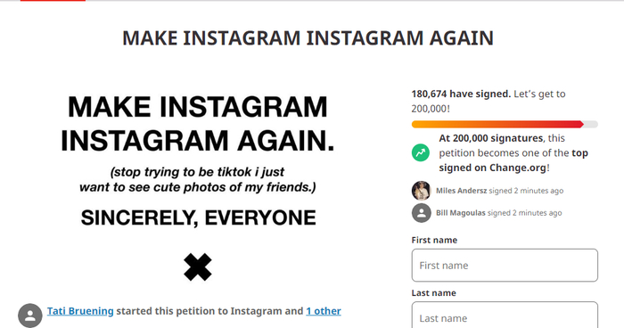 (观察者网讯)“Make Instagram Instagram again(让IG做回IG)”,截至北京时间7月27日16时,由摄影师Tati Bruening发布的这项倡议已获得了超199万点赞,相关请愿的签名人数超18万。