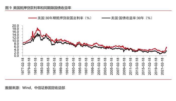而在信贷市场中,美国国债收益率是常用的贷款定价基准利率之一。美国企业和居民所能获得的贷款利率可以被拆分为用于贷款定价的基准利率以及银行加点这两部分。在国债收益率发生变化的时候,假设银行加点不变,则贷款利率会随着国债收益率的变化而相应变化。以美国抵押贷款利率为例,过往40年间,美国国债收益率和抵押贷款利率的走势较为一致,国债收益率发挥了定价基准的作用。除此之外,银行加点与借款人的信用资质直接相关,因此贷款利率还会受到银行风险偏好和加点变化的影响。