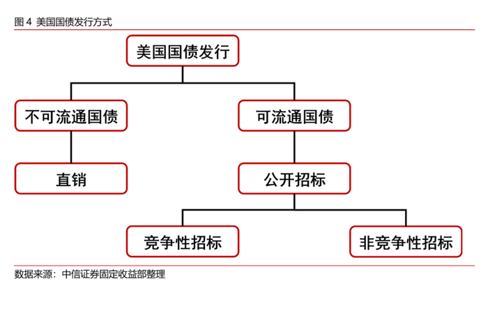 从美国国债的发行方式上来看,美国国债主要采取直销和公开招标的进行发行。两种发行方式根据美国国债的可流通性进行区分,其中不可流通国债如储蓄国债需要采用财政部直销系统(Treasury Direct,TD)进行发行,而可流通国债则采用公开招标的方式发行。公开招标方式可进一步分为竞争性投标和非竞争性投标。