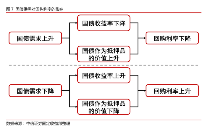 在美国国债供不应求,国债收益率较低的时候,国债作为抵押品的价值相对较高,回购交易的资金融出方可能需要相应调低回购利率来获得国债;与之相对,在美国国债供过于求,国债收益率较高的时候,国债作为抵押品的价值就相对较低,回购交易的资金融出方就可以以相对较高的利率融出资金。