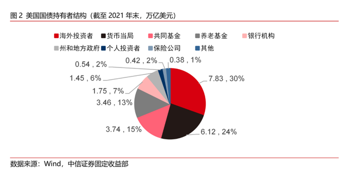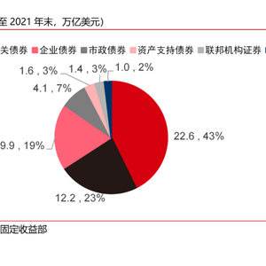 在过去200余年,美国国债市场经历了长足发展。截至2021年末,美国国债的存量规模已经达28.4万亿美元,其中在债券交易市场中的存量规模为22.6万亿美元,占美国债券市场存量规模的42.8%,是美国债券市场规模占比最高的债券品种。由于美元的国际地位提升了美国债券市场的国际化水平,海外投资者是美国国债的第一大持有者。货币当局、共同基金和养老基金则分列2-4位,其余投资者的占比则相对较小。美国国债二级市场2021年的日均成交量约为6241亿美元,占美国债券市场总成交量的65.3%。其中期限在1至10年的中期国债在可流通国债中的存量和交易量占比都是最高的,由于美国国债的低风险和高流动性的特点,使其成为了美国金融市场中的重要担保品。