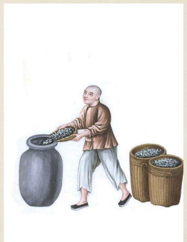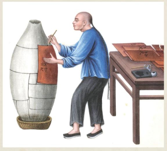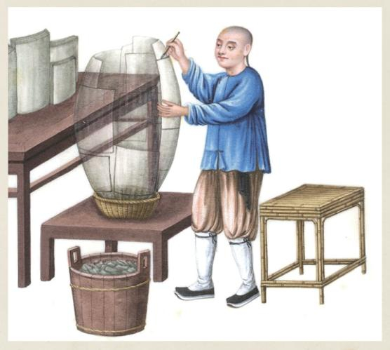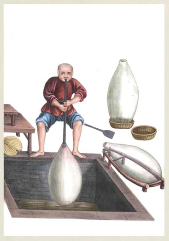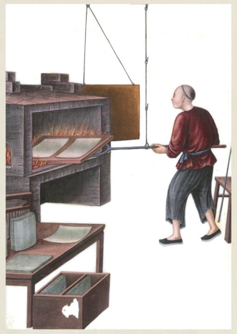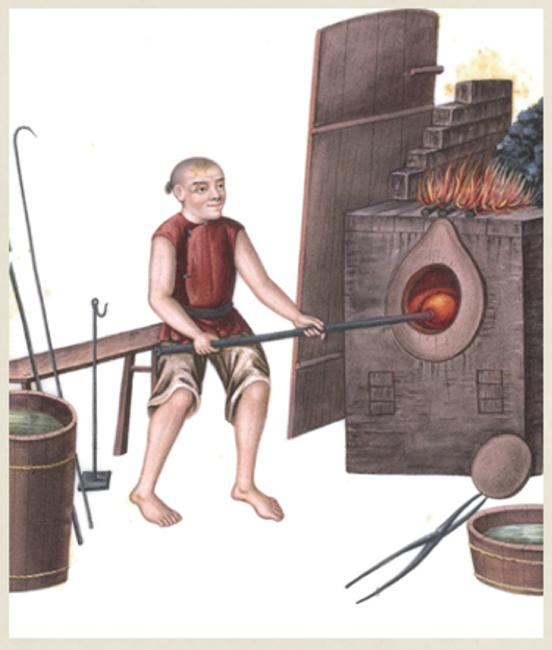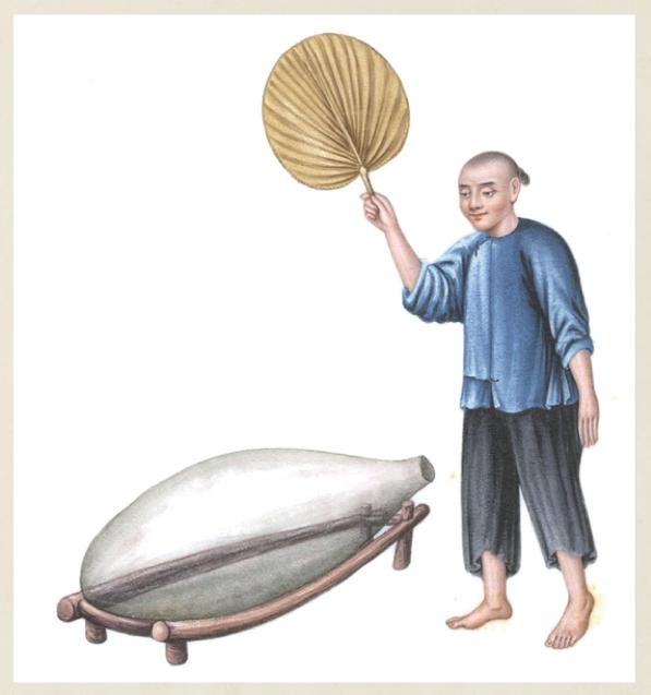 图中的男子正通过用扇子扇风使玻璃冷却。李太郭在《真实的中国人》一书中也有记录:“作坊中一般雇佣三人,一个会在窑炉边为挑料者扇风冷却,以至于不被窑炉中的热量灼伤,世界上也许没有人比中国人更懂得扇子的原理了。另一个助手会在挑料后关闭炉门,并进行必要的吹制。由于使用木炭,因此有足够的热量。”