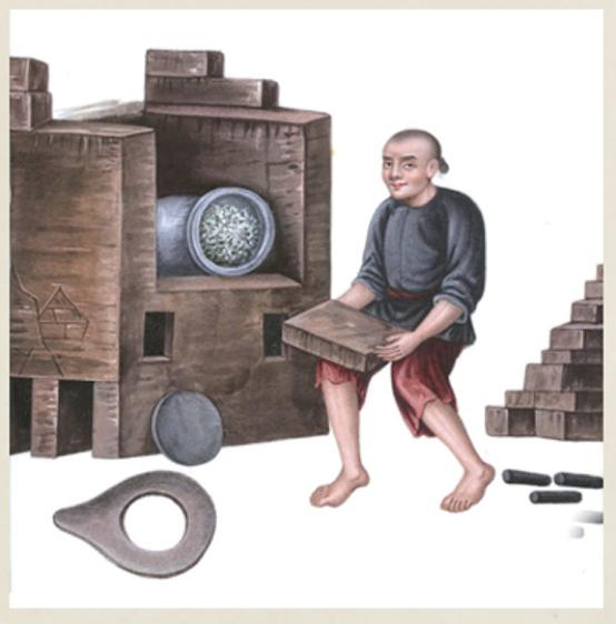 图中描绘的是劳动者在向窑炉中添加原料的场景。英国传教士李太郭(George Tradescant Lay)1843年来到广州,在其《真实的中国人》(The Chinese as They are: Their Moral Social and Literary Character)一书中记载了他亲见的广州玻璃窑炉:“窑炉是一座圆柱形的石造建筑,一侧凿孔,底部火源加热,内部的坩埚倾斜成一定的角度以便存放热熔玻璃液体。加热时,窑炉口部分遮盖一半圆形铁质圆盘。”