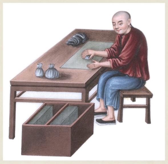 图谱记载了制作平板玻璃的技术,虽然此前的文献中也存在有关玻璃屏风和玻璃窗的记载,但综合文献和考古发现来看,清代晚期这一技术才真正成熟。这时使用的平板玻璃制作技术并不是现代工业中的平拉法、浮法或者引上法,而是先吹出大玻璃泡,再进行裁片磨制。图中反映的就是裁片前用墨线进行标记的场景。从图中可以看出,为了确保裁片大小合度,古人会用专门的木片以辅助画线。