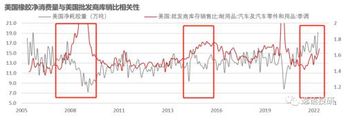 批发商库销比与橡胶消费量有一定负相关性。从美国批发商汽车及零部件数据来看,2007年11月出现增长,领先橡胶消费量约10-14个月左右,据此推测今年消费量回落约在2022年10月至2023年2月左右。