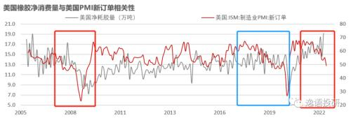 欧盟消费者信心指数领先约14-15个月。根据欧盟消费者信心指数数据显示,2007年7月信心指数进入下滑通道,而橡胶消费量于2008年9-10月出现下滑,领先约14-15个月左右。据此推测今年预计橡胶消费量2022年9月-10月出现下滑趋势。