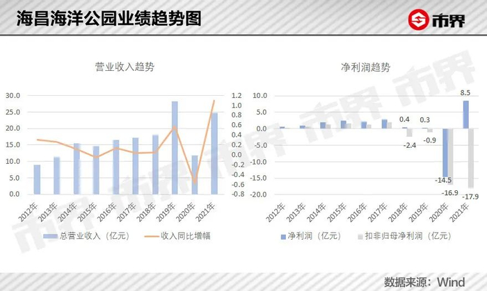 海昌海洋公园自2014年上市后,业绩只在上海和三亚海洋馆开园后的2019年有明显的增长,2020年受疫情影响园区收入大幅下滑且陷入巨亏,2021年收入虽有反弹,但扣除非经常性损益后,亏损仍较上一年有所扩大。