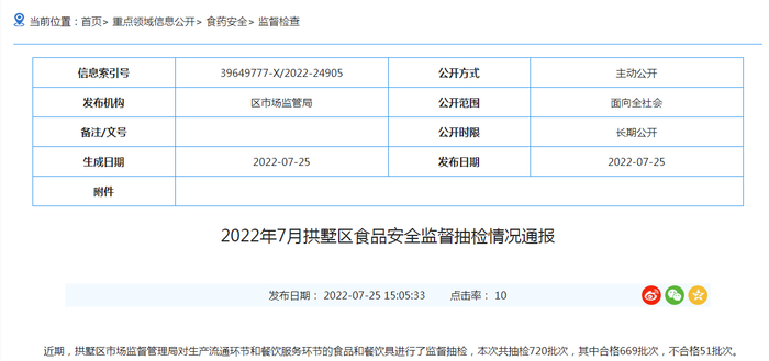 据通报,近期拱墅区市场监督管理局对生产流通环节和餐饮服务环节的食品和餐饮具进行了监督抽检,本次共抽检720批次,其中合格669批次,不合格51批次。
