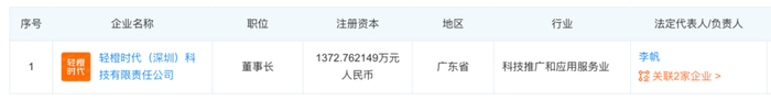 值得注意的是,据企查查显示,轻橙时代董事长另有其人,“李帆”。2021年11月17日,李帆以投资人身份首次出现在轻橙时代的股东序列里(出资355万元,占股32.66%)。今年4月2日,“李帆”代替边标成为董事长、法定代表人。