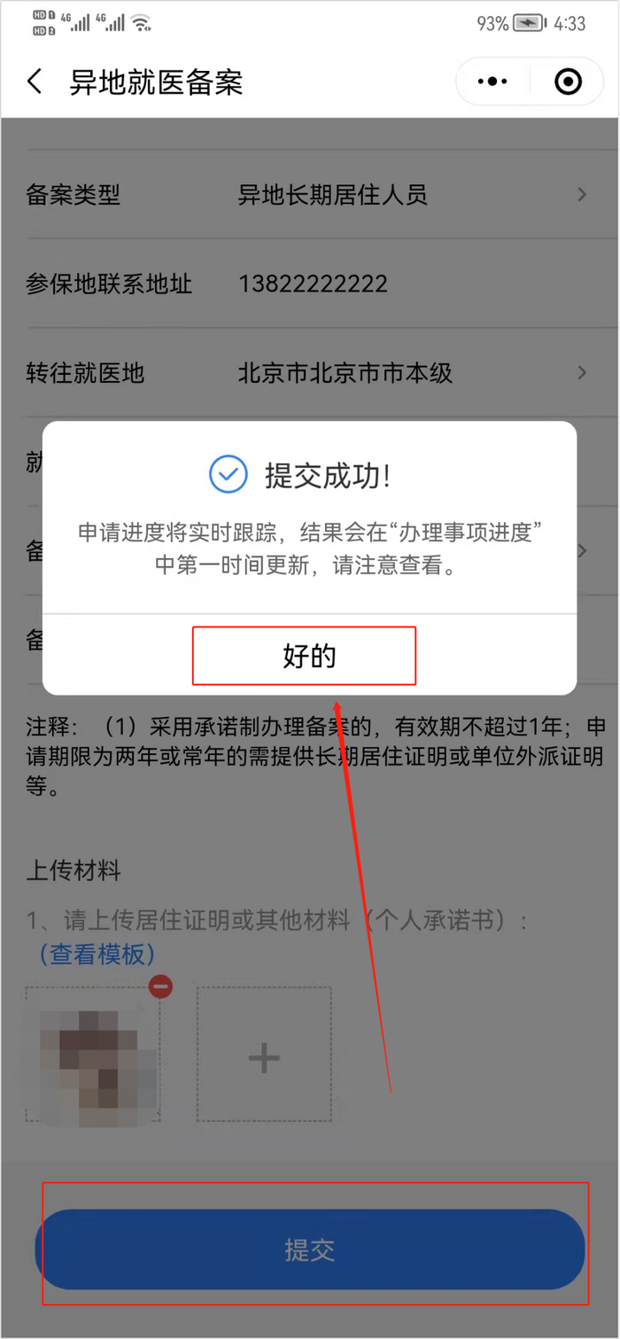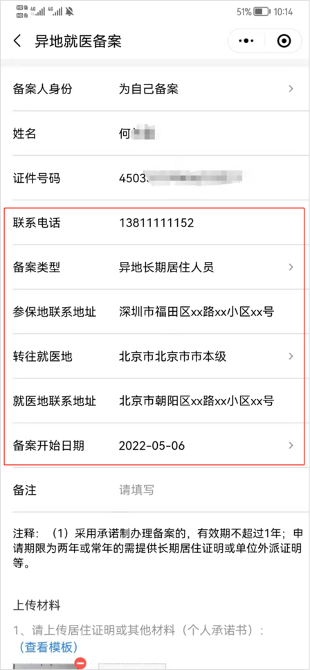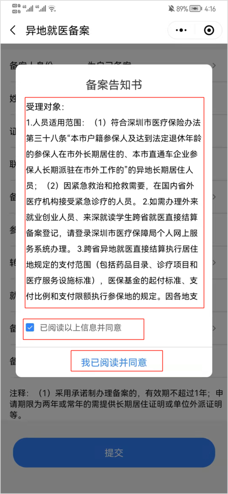3、下滑并仔细阅读备案告知书,阅读完毕后勾选“已阅读以上信息并同意”,再点击“我已阅读并同意”;按照页面要求,填选备案申请信息,包括联系电话、备案类型、参保地联系地址、转往就医地、就医地联系地址以及备案开始时间。
