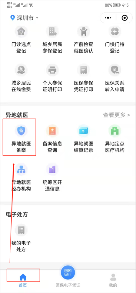 2、首页下滑,在“异地就医”专栏,点击“异地就医备案”,进入业务办理页面。