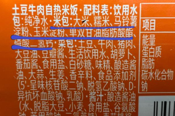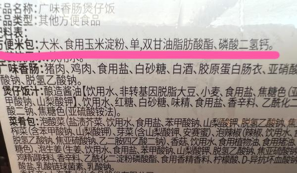 不难发现,虽然不同品牌对方便米包的命名不同,但原料大致相似,以大米为主,辅以其他碳水类原料,以及单,双甘油脂肪酸酯、磷酸二氢钙这两种国家允许的食品添加剂。