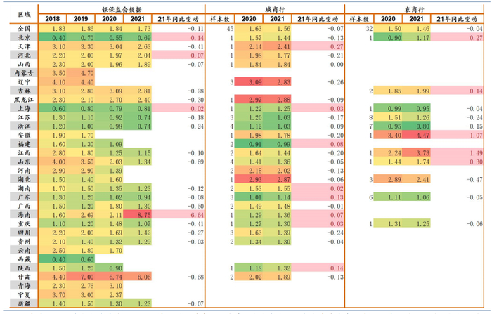 注:不良率银保监会数据来自各地银保监会披露,城商行、农商行数据根据77家发债城农商行分注册省份进行统计,数据统计口径影响统计结果