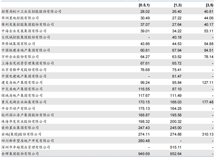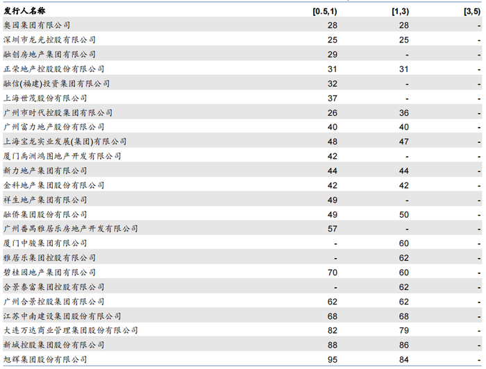 图表:碧桂园、新城等民企境内地产债中债估值净价折价幅度较高(单位:元,分行权剩余期限)