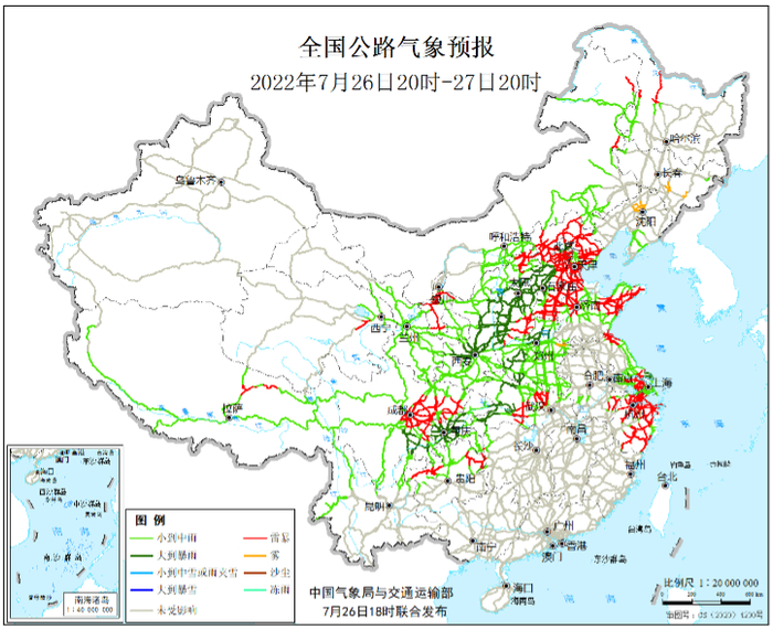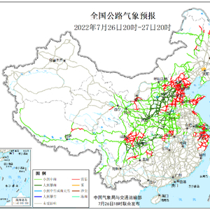 7月26日20时至27日20时,西北地区东部、内蒙古东部、华北大部、黄淮西部、湖北西部、四川盆地南部和东部等地部分地区有中到大雨,其中,陕西中部、山西中部、河北中西部、四川盆地南部、重庆西部等地部分地区有暴雨。北京中部、天津南部、河北大部、内蒙古东北部、黑龙江西北部、江苏东北部和东南部、浙江东部、山东西北部和东部、湖北中部、四川东部、贵州中部、西藏北部、宁夏中南部等地局地有雷暴。另外,辽宁北部、吉林东南部等地局地有雾。