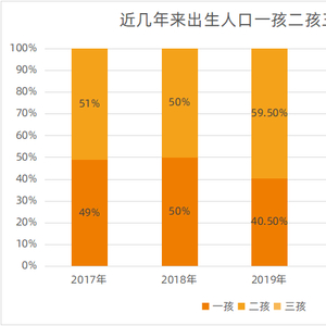 近年来出生人口中一孩二孩三孩占比,数据来源:国家卫健委官网(2017年-2020年二孩占比数据为二孩及以上占比数据)