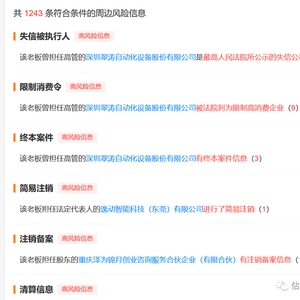 带着这个好奇心,估值之家查到一些信息,如下图一天眼查中显示,李教授曾担任高管或持股的公司涉及1243条风险。其曾担任高管的深圳翠涛自动化设备股份有限公司是最高人民法院所公示的失信公司且该企业被限制高消费;担任法人的逸动智能科技(东莞)有限公司进行了注销;和几位哈工大学生一起创办并担任股东的比锐精密设备(深圳)有限公司,以及担任法人的深圳洛神园科技开发有限公司等也已经有了清算信息。