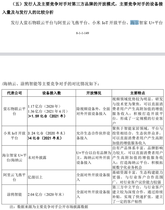 截至2021年12月末,萤石物联云平台接入IoT设备数超过1.59亿台,其中视频类IoT设备数量约1.3亿台,萤石物联云平台用户数量突破9500万名,月活跃用户突破3500万名,“萤石云视频”应用拥有行业内前两位的月度活跃用户数量。“发行人的物联网云平台已经建立了一定的规模体量,但对比华为、小米、涂鸦智能等竞争对手,在设备接入数量、产品类型丰富度等方面仍存在部分劣势。”