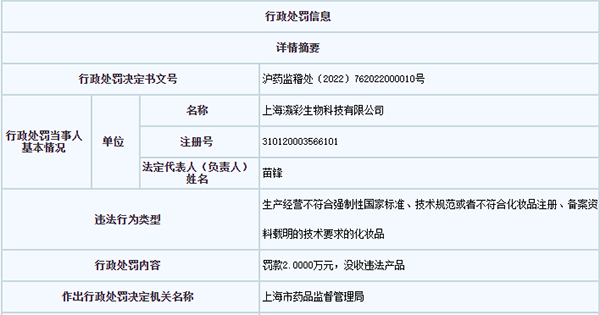 中国网财经7月27日讯(记者 杜丁)日前,上海市市场监督管理局发布的一则行政处罚信息显示,上海瀛彩生物科技有限公司因生产经营不符合强制性国家标准、技术规范或者不符合化妆品注册、备案资料载明的技术要求的化妆品,被罚款2万元。