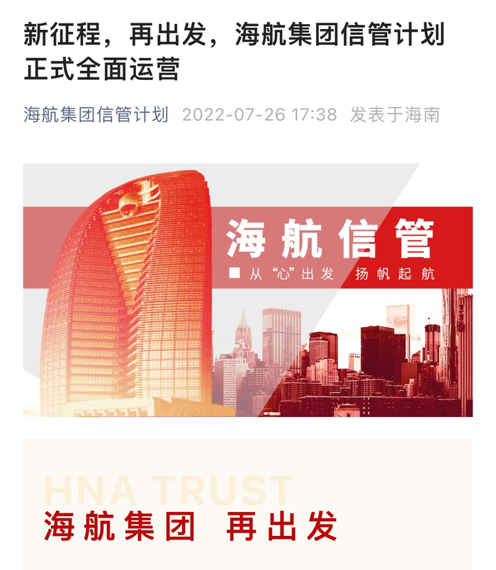 7月26日,作为重要偿债主体的“海航集团信管计划”正式全面运营。