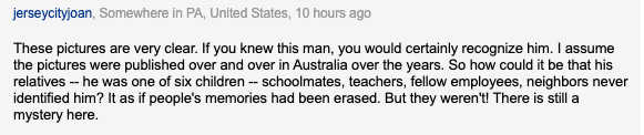 这些照片非常清晰。如果你认识这个人,那你肯定一眼就能认出他。我想当年这些照片在澳大利亚也是被反复刊登过的,那他的亲戚、兄弟姐妹、同学、老师、同事、邻居等人怎么没一个人认出他呢?感觉这些人的记忆都像被擦除了一样,这里依然有谜团没有解开。