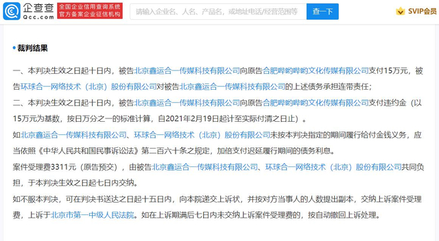 企查查APP显示,近日,合肥哔哟哔哟文化传媒有限公司与北京鑫运合一传媒科技有限公司、环球合一网络技术(北京)股份有限公司合同纠纷一审文书公布。