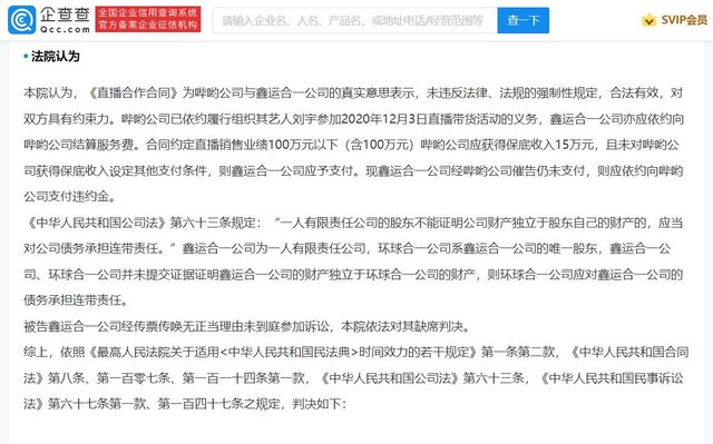 法院认为,合同为双方真实意思表示,哔哟公司已履行组织其艺人刘宇参加直播带货的义务,合同约定直播销售业绩100万元以下(含100万)哔哟公司应获得保底收入15万,且未设定其他支付条件,则被告应予支付。最终,法院裁定鑫运合一公司向哔哟公司支付15万元及违约金,环球合一公司承担连带责任。